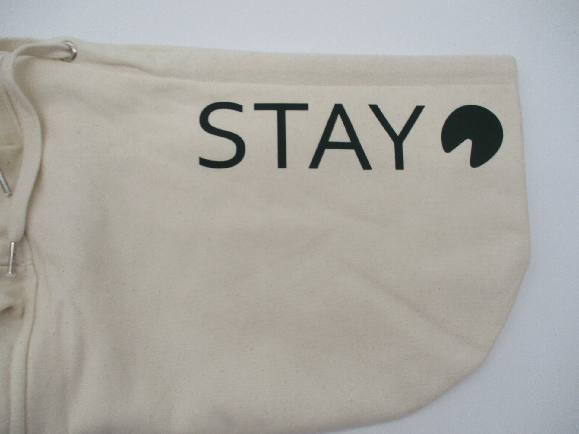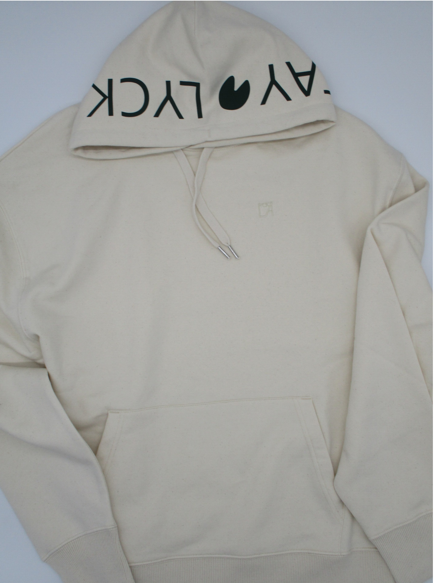 Unisex-Hoodie in Creme mit tannengrünem "STAY LYCKA" Schriftzug auf Kapuze