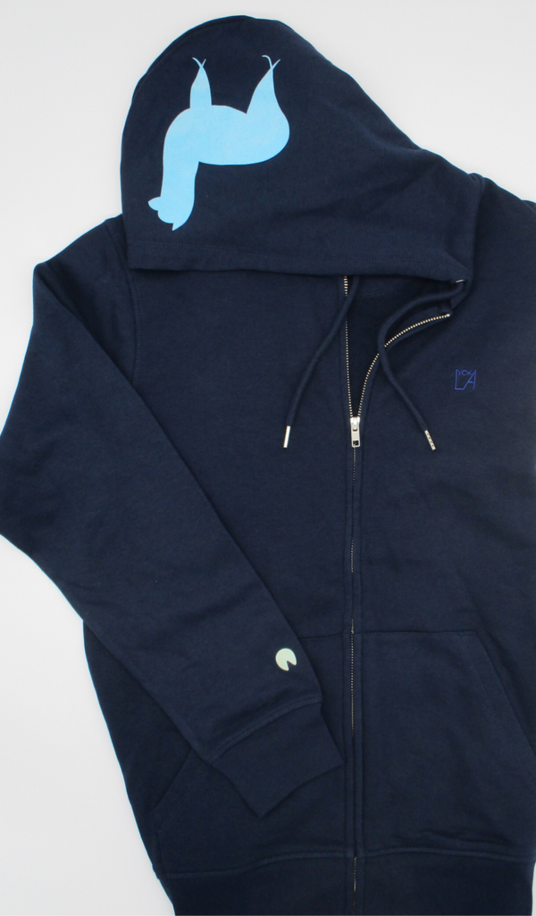 Sweatjacke Unisex in Dunkelblau mit türkisfarbenem Alpaka auf der Kapuze
